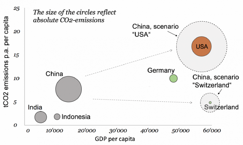 The two dotted bubbles in Figure 2 exemplify two scenarios for Chinas future path. The first scenario assumes the same emissions and GPD per capita as the US (China, scenario “USA”), while the second assumes the values per capita in Switzerland (China, scenario “Switzerland”). The size of each of the two dotted bubbles shows the absolute CO2 emissions under a scenario’s conditions and highlights the impact that China’s large population has on its absolute carbon dioxide output. China’s emissions are currently only a little less than two-fold that of the US, but with about four times of the population. Scenario “USA” shows, that if China’s per capita CO2 emissions were to rise to similar values as the US’, its absolute emissions would more than double, summing up to nearly five times the current emissions of the US. The threat of this happening is deemed real by researchers. A Harvard study from 2016 estimates that China’s emissions could rise by more than 50% already in the next 15 years, if no proper mitigation is enacted. If, however, proper mitigation measures are implemented and if China manages to decrease its per capita emissions to, for example, similar values than Switzerland, then Chinas total carbon dioxide output could even be cut in half. Then the total amount of emissions would equal that of the US, albeit the large differences in the size of the populations. Asia remains, not only economically, but also environmentally, the most pivotal region in the world. The importance of taking an effort to achieve a lowcarbon environment becomes imperative and it is left to governments to tackle the task with a focused and common vision – a challenge that has been acknowledged by Asian law-makers.