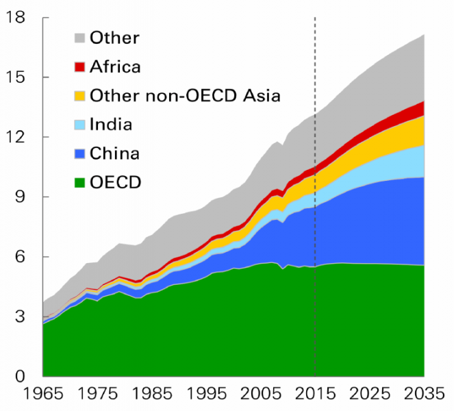 Greenhouse gas emissions stemming from Asia currently account for nearly 40% of all global emissions. Energy consumption in the region, which is directly linked to carbon dioxide output, is expected to further rise quickly over the next 15 to 20 years. Figure 1 shows the expected worldwide energy consumption separated by region.