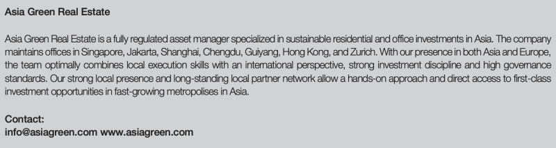© 2020 Asia Green Real Estate AG, Switzerland. No warranty can be accepted regarding the correctness, accuracy, uptodateness, reliability and completeness of the content of this document. Asia Green Real Estate expressly reserves the right to change, to delete or temporarily not to publish the contents wholly or partly at any time and without giving notice. This document as well as its parts is protected by copyright, and it is not permissible to copy them without prior written consent from Asia Green Real Estate. This material does not take into consideration the specific investment objectives, financial situation or particular needs of any person that enters into a relationship with Asia Green Real Estate. No representation or warranty, expressed or implied, is made by Asia Green Real Estate regarding future performance. This material is not directed to, or intended for distribution to or use by, any person or entity that is a citizen or resident of, or located in, any locality, state, country or other jurisdiction where such distribution, publication, availability or use would be contrary to law or regulation or subject Asia Green Real Estate to any registration requirement. The document may contain forward-looking statements that reflect Asia Green Real Estate's current views with respect to, among other things, future events and financial performance. Any forward-looking statement contained in this material is based on our current estimates and expectations and are subject to various risks and uncertainties.