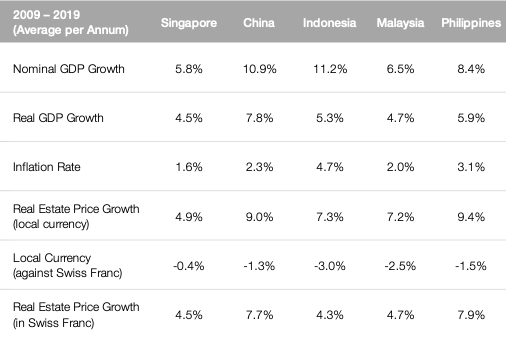 First, high nominal GDP growth rates were accompanied by strong real estate price growth in local currencies. China for example has high nominal (10.9% p.a.) as well as real (7.8% p.a.) GDP growth rates which led to a substantial real estate price growth (7.7% p.a.) over the last years. In comparison, with more moderate GDP growth rates, Singapore's nominal real estate price growth was lower than that in China.