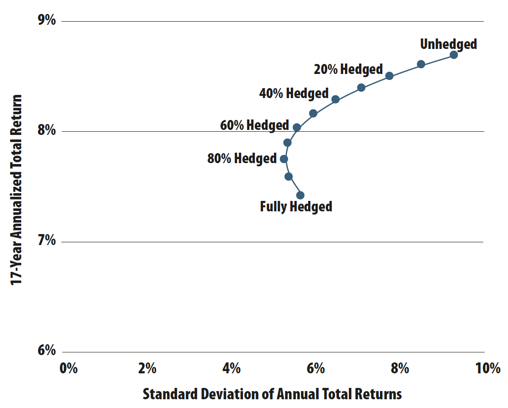 When hedging, an investor needs to decide on the hedge ratio: how much of the total exposure shall be hedged. Even if a 100% currency hedge seems attractive at first glance, various studies have shown that this was not efficient in the past. Figure 2 illustrates the risk-return tradeoff for portfolios with different hedge ratios along the efficient frontier from 2001 to 2017. The maximum return was achieved without hedging any currency risks, and the global minimum-variance portfolio was achieved with an 80% hedge rather than a full hedge. In addition, Figure 2 shows that a fully hedged portfolio was not efficient either from a total return or a standard deviation perspective.