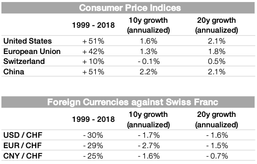 A comparison with Switzerland shows a different situation. The Chinese currency weakened against the Swiss Franc over time and lost 25% in value within the last 20 years. But investors got compensated in real terms since the Chinese CPI grew substantially more than consumer prices in Switzerland between 1999 and 2018.