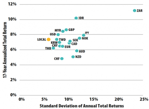 For example, measured in the Indonesian Rupiah (IDR), the index would have returned 10.2% with a standard deviation of 11.8%. From the perspective of a Swiss franc (CHF) oriented investor, the index would have returned 4.9% with an 8.5% standard deviation. The large difference in performance illustrates the substantial impact that currencies can have. While Figure 1 highlights how much the currency effect has been in the past, investors may face even higher currency risks in the future. Recent MSCI research found that, in the aftermath of the global financial crisis, foreign currency risks were rising as a combination of quantitative easing, currency wars, and political uncertainty made currencies more volatile.