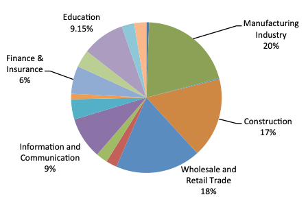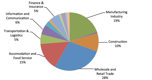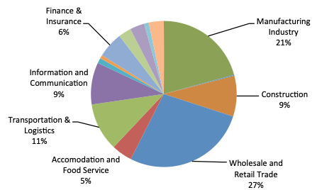 The city benefits from its strategic location and has been propelled by strong wholesale and retail trade. It has been a center for trading and shipping for Southeast Asia over centuries. Further, the manufacturing and construction industries contribute substantially to the city's success. Figure 6 outlines the different industries' contribution to the region's economic output. Mainly due to an increase in productivity, the economy of South Sulawesi's capital has been able to grow at 8.5% per annum over the last five years.