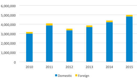 Next to the historically strong wholesale and retail trade (see figure 4), which has consistently dominated the city's economy, its cooler climate and fascinating nature make it one of the most popular destinations for Indonesian travelers. Figure 5 shows that between 2000 and 2015, the number of visitors grew at about 10% per annum, dominated mainly by visits of domestic tourists.
