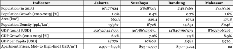 Focusing on these two statistics and taking other criteria such as infrastructure investment, trade, resource availability, education, geography, and political importance into consideration, three cities are of special interest: Surabaya, Bandung, and Makassar as the capitals of East Java, West Java, and South Sulawesi respectively.