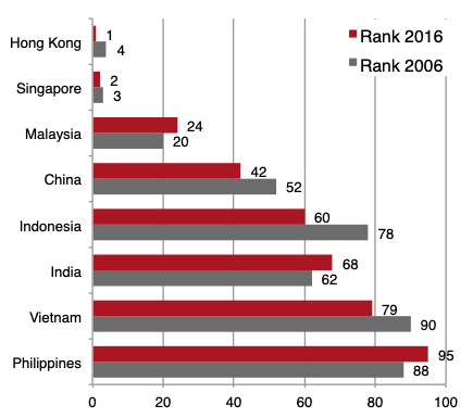 Many Asian countries have invested heavily into infrastructure over the previous years and some countries made large leaps in improving their infrastructure as can be seen in the ranking. Over the past ten years China (+10 spots in the ranking), Indonesia (+18) and Vietnam (+11) improved significantly, while Hong Kong (+3) and Singapore (+1) even managed to occupy the two top positions. Meanwhile, India (-6), Malaysia (-4) and the Philippines (-7) lost a few positions, as their improvement was slower relative to other countries. However, in absolute terms, these countries also improved their infrastructure stock.