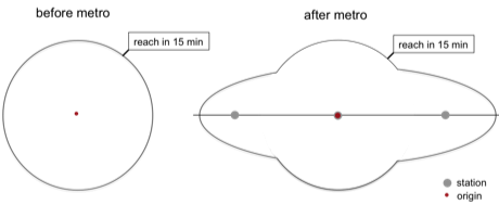 The enlargement of the area that can be reached within 15 minutes – thanks to a new metro stop – from a given location is illustrated in figure 2.