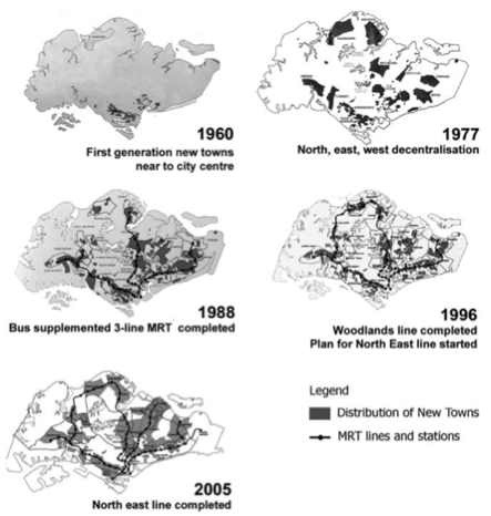 Figure 1 shows the dynamics of the urban growth pattern in Singapore from 1960 to 2005. In 1960, the new towns were planned within 8 kilometers from the CBD. Alongside growing network of MRT, the transit-oriented new town developments and compact residential clusters along the lines grew rapidly and created a decentralization pattern. It also caused the population of public housing to increase significantly from 9% in 1960 to 84% in 2000 (Curtis et al. 2009).