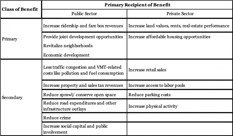 Institute for Transportation & Development Policy(ITDP) provides a TOD Standard to measure achievement of any TOD projects which consists of three standards of Gold (85-100 points), Silver (70-84 points), and Bronze (55-69 points). The assessment will capture eight key principles of: (1) walk–15 points; (2) cycle–5 points; (3) connect–15 points; (4) transit–requirement; (5) mix–15 points; (6) densify–15 points; (7) compact–15 points; and (8) shift–20 points. The basic and most important requirement is that the project must be within a maximum of 1-km walking distance to a high-capacity transit station or less than 500-m to a direct service station. Otherwise, the project is not considered a TOD project.In general, Transit-Oriented Development will contribute to multiple tangible and intangible benefits for both private and public sectors, as shown in Table 1.